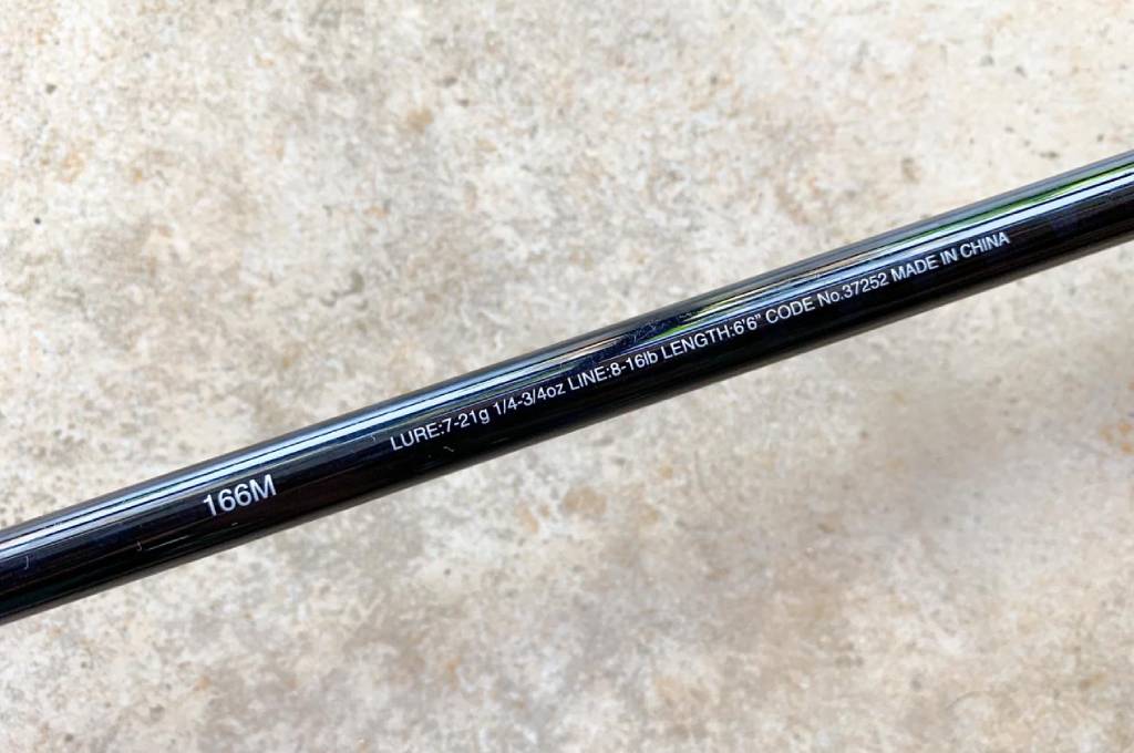 A primeira informação que precisamos checar na vara de pesca é o peso que ela está apta a arremessar. Normalmente, essa informação vem normalmente indicada pelas palavras lure ou casting weight, que significam respectivamente isca e peso de arremesso em inglês. A vara que ele escolhe mostra a inscrição ‘lure: 07 a 21g’.